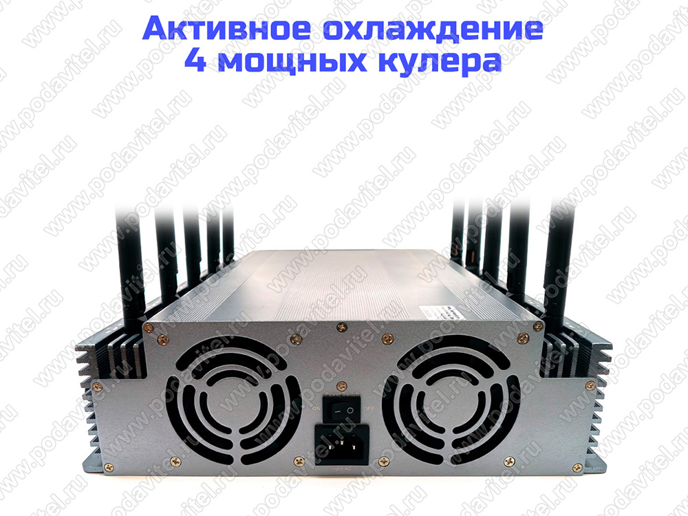 Активное охлаждение. 4 мощных кулера встроены в корпус подавителя дронов и связи, которые позволяют устройству работать продолжительное время без перегрева.